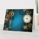 Turquoise, textured, steampunk background with brass and gold gears, a silver key and the clock. Steampunk style.