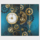 Turquoise, textured, steampunk background with brass and gold gears, a silver key and the clock. Steampunk style.