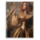 This steampunk Victorian golden astronomer in a gold and brass dress with clockwork gears uses an elegant telescope to observe a historical steampunk fantasy world where retro-futuristic science reigns.