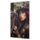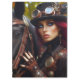 A stunning steampunk Victorian Lady dark rider, with piercing blue eyes, red hair, goggles and top hat, stands tall beside her magnificent black horse in leather clothing with clockwork gears in a steampunk historical realm.