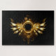 Shiny mechanical wings, with gears and brass round banner. Steampunk