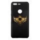 Shiny mechanical wings, with gears and brass round banner. Steampunk