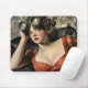 A steampunk mouse pad of a beautiful steampunk woman in a red dress and gears on her head.