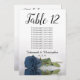These beautiful table number cards will make it easy for your guests to find their seats at your wedding reception. They feature a simple yet elegant design with script calligraphy lettering and a single long-stemmed dusty steel blue colored rose lying on its side reflecting in water. The card includes a seating chart with 10 names. There is also space for the couple's names and wedding date. This card is available in a variety of sizes and is larger than our standard table number cards.