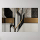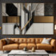 A bold fusion of geometric structure and organic delicacy: stylized black-and-white leaves intertwine with wood, metal, and golden diagonal lines. Art that bridges contemporary architecture and abstract nature—sophisticated, balanced, and deeply narrative.