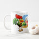 Coffee mug featuring cartoon rooster and steer on a farmstead.