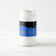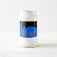 black and blue logo on white stein