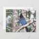 Photo of a Steller's Jay sitting on a tree branch covered in snow during the winter. The blue and black bird is in profile and is surrounded by branches with more trees in the background. This nature photo of a bird in winter can be customized and printed on many different products.