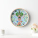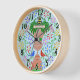This beautiful personalized floral wall clock has an intricate, modern flower garland in a rainbow of bright color. The flowers and green vines weave behind the black clock numbers. It all wraps around a pretty stenciled urn / vase in terracotta pottery coloring that has a retro arts-and-crafts decorative look.