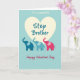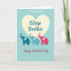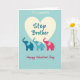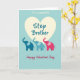 This greeting card features a large creamy off-white heart centered on a pale blue background, with a thin border of small white hearts around the edges. Inside the heart, the words “Step Brother” appear in teal, written in a curly, flowing letter style that feels friendly and close. Below the heart, three cute elephants walk in a line: one deep blue, one light blue, and one bright pink. Each elephant has an upturned, curled trunk, like they’re happily cheering, and their simple faces look calm and sweet. Near the bottom, “Happy Valentine’s Day” is written in rosy red with the same flowing letter style, placed as a finishing line under the elephants. The mix of cool blues with the pop of pink and the red message makes the whole scene feel warm and caring ❤️. It’s a meaningful card to give because it shows affection in a gentle, family-focused way, perfect for sharing Valentine’s Day sentiments 🥰.