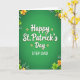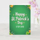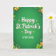 This card features an emerald green background with a gentle gradient that adds depth, like a softly lit field in Ireland. Clover clusters and leafy sprigs decorate the corners in layered greens with touches of golden-orange and warm yellow, giving the edges a sunny contrast ☘️. Centered in the middle, the phrase “Happy St. Patrick’s Day” appears in creamy white lettering with a light golden-tan shadow that makes the words look slightly raised. Fine golden flourishes sit near the main line of text, curling around it like decorative accents on a festive banner. Just below, “STEP DAD” is set in uppercase letters, spaced neatly and easy to read, in a matching light tone that stands out against the green 💚. The layout feels friendly and close, as if the greeting is meant for someone you’re glad to have in your life. Warm yellow highlights around the foliage help frame the message without crowding it. The corner clovers angle inward toward the center, with the brightest leaves clustered near the top edges.