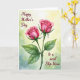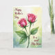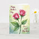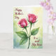 This greeting card features a soft watercolor-style illustration of two pink roses leaning toward each other on a single green stem, like close friends sharing a quiet moment ❤️. Each bloom shows layered petals with deeper fuchsia near the center fading to blush at the edges, giving them a velvety look. A small cluster of green leaves with fine veins and gently jagged edges sits below, adding contrast and grounding the flowers. The background is softly blurred, shifting from pale yellow light in the upper right to muted green toward the lower left, like a calm garden glow 🌼. In the upper left, the words “Happy Mother’s Day” appear in a deep burgundy, set apart from the flowers so the blossoms stay center stage. In the lower right, “to a sweet Step-Mom” is placed in the same burgundy color, balancing the layout across the page. The two roses are centered, with the stem angled slightly upward and the leaves clustered near the lower middle.