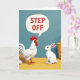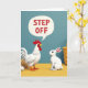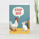 This design shows two glossy, three-dimensional animal figures facing each other on a bright yellow ground, like a tiny barnyard stage where romance or friendship feels possible in the pause between them 🌷. A white rooster with a red comb and wattle stands squarely near a small straw nest holding one white egg, its yellow beak and orange legs angled toward the other figure as if guarding something precious. Across from it, a white rabbit holds a calm stance, with pink inner ears and large dark eyes that meet the rooster’s stare with gentle curiosity 🐇. The background is a soothing teal-blue field with faint horizontal lines that add depth without distracting from the pair. Above the rooster, a rounded speech bubble floats near the top area, carrying the words “STEP OFF” in red letters. Even lighting creates soft shadows under their feet and along their rounded shapes, making the moment feel like a quiet face-off with a tender undertone. On the far right edge, a rustic woven basket peeks into the frame against the teal backdrop.