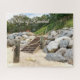 Take a mindful journey with Steps of Renewal, a calming jigsaw puzzle from Quiet Ember Puzzles. This scenic photograph captures a wooden staircase rising from the sandy beach, framed by weathered posts, thick rope, and rugged shoreline rocks. The soft greens of the hillside trees and the gentle tones of sand and stone invite you to pause, breathe, and reflect.