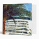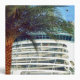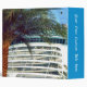 A close in view of a portion of the massive stern of a voyager class cruise ship. A few of her aft balconies - prime cruising real estate in the opinion of some cruisers - are clearly visible from this perspective. The huge vessel creates a striking contrast to the palm tree in the foreground.