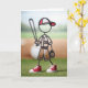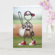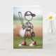A stick-figure character dressed as a baseball player stands on the green grass of a baseball field holding a bat and glove for baseball birthday.