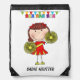 Stick Figure Cheerleader drawstring bag, a fun, colorful design girls who love cheering are sure to love, features a little stick figure cheerleader in a red and yellow uniform with yellow pom poms, banner flags, text that reads Rah Rah Rah, and an area you can personalize with a name!