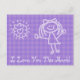 Stick figure girl wearing a dress with outstretched arm next to a heart shaped sun. Figure is drawn in a shade of orchid and a white outline. The background of the postcard is a gingham pattern in shades of lavender and orchid.