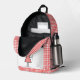 Cute stick figure girl wearing a red and white gingham dress, pearl necklace, sneakers, and holding a bouquet of daisies.