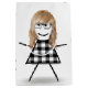 Cute stick girl with hair, plaid dress and glasses on white with black and white buffalo plaid pattern.