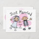 Cute happy stick figure couple with pink hearts in the background. The bride is wearing a wedding dress and the groom is wearing a tuxedo with bow tie. Text says JUST MARRIED. Customize it with your wedding date or whatever you like. Perfect for your honeymoon. PinkInkArt original!