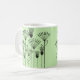 This mug has a mid-century modern design of plants made from lines, circles, triangles, rectangles, and squares in black on a green background.
