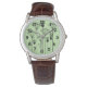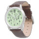This men's watch has a mid-century modern design of plants made from lines, circles, triangles, rectangles, and squares in black on a green background.