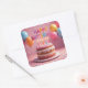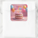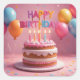 A birthday cake with flickering candles, colorful balloons, confetti, and a HAPPY BIRTHDAY sign cover this party sticker.