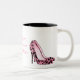 Fun coffee mug with graphics of pink and black jaguar fur pattern stiletto high heels. Pink text, in the middle reads My day doesn't start till I put on my favorite shoes. Personalize the text to read anything you want. Great ladies mug for home or office.