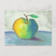 Expressive still life apple. Green, blue, yellow and orange all mingle together to create a unique apple in a kaleidoscope of colors. The apple sits on blue table with a subtle gray wall behind.