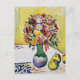 A fine art postcard with the painting Still Life Flowers and Three Apples (1910) by the German Expressionist artist August Macke (1887-1914). A bouquet of wildflowers in a green vase on a table with fruit against a yellow background.