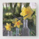 3 bright yellow and orange daffodils of various species, are held in 3 vintage British bottles, with an ancient Roman road, the Fosse Way, as a backdrop.