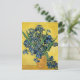 A fine art postcard with the post-impressionist painting titled Still life with Irises (1890), by the Dutch artist Vincent Van Gogh (1853-1890). A still life with a bouquet of blue-violet iris in a clay jar against a golden background.