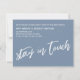 In this piece, the hand-lettered script font was used to create graphics depicting the words "new address. still living out of boxes. don't judge." on the front, and "stay in touch" on the back. The faded denim blue background can be changed to any color you prefer. Please reach out with any special requests or for customizing assistance. // 100 //
