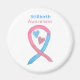 Stillbirth uses a pink and blue ribbon to support awareness for its cause. The custom magnet features an awareness ribbon heart art magnet with the message "Stillbirth Awareness". The NIH defines pregnancy loss as "when a pregnancy ends unexpectedly before the 20th week. It is sometimes called early pregnancy loss, mid-trimester pregnancy loss, miscarriage, spontaneous abortion, or fetal demise." The NIH states "stillbirth refers to the death of a fetus at or after the 20th week of pregnancy."