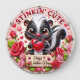 This whimsical circular wall clock features a 3D digital illustration of an adorable baby skunk with large, expressive eyes holding a bright red heart. At the top, bold red embossed text with a white outline playfully reads "STINKIN' CUTE". A wooden sign at the bottom displays the embossed text "Happy Valentine's Day" in elegant black script. The character is framed by vibrant pink and red roses with green leaves against a soft pink and cream background. A thin, white decorative border edges the entire design. The clock face border features black, outlined numbers from 1 to 12 positioned around the inner perimeter, with simple black hands centered over the illustration.