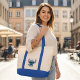 Love the durable cream colored canvas and navy blue contrasted handles. Perfect for carrying my laptop and papers.
