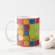 Mug with colorful circle design and on a green background are the words, "Stitch your stress away".
