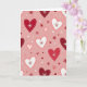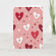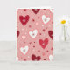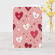 This Valentine’s Day card is covered in a repeating heart pattern set on a soft pink background that gently shifts between shades. Larger hearts in red, deep red, and white stand out across the card, each outlined with dashed lines that resemble stitching. Many of these hearts include a small starburst or asterisk shape in the center for added detail. Smaller hearts in pink, red, and white fill the spaces between, along with tiny dots and little star-like bursts. There is no text on the front, so the heart pattern fills the entire card from edge to edge. The overall look feels warm and romantic, making it a lovely choice for sharing Valentine’s Day love 💕