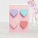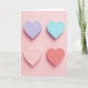 This greeting card features four hearts arranged in a neat 2×2 grid on a soft, light pink background. Each heart has its own gentle color, creating a warm and welcoming mood. The top left heart is a light lavender, followed by a calming teal heart on the top right. Below them, a rose-pink heart sits on the left, paired with a soft coral-pink heart on the right. Each heart has a subtle raised look with soft shadows that add depth. White dashed outlines surround the hearts, giving the impression of careful stitching and a handmade touch. The gentle lighting enhances the pastel tones, creating a calm, tender design that feels thoughtful and affectionate, perfect for sharing Valentine’s Day love.