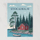 vector image of Stockholm, Sweden, focusing on a peaceful island scene in the Stockholm archipelago. Feature a traditional red wooden house, tall pine trees, and a small boat docked on crystal-clear water. Keep the sky bright blue with a few soft clouds. Use burgundy red, navy blue, and ivory. Add “STOCKHOLM” vertically on the left in a sleek, modern sans-serif font.