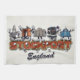 The icons and landmarks of the borough of Stockport, in Greater Manchester, England, featuring a stylized cartoon character versions of its townscape, including (from left to right) Stockport Town Hall, Stockport Viaduct, Stockport Plaza, the number 192 bus to Hazel Grove complete with a Stockport hat, and Stockport Pyramid. Stockport is spelled out in traditional red brick and sandstone, with cotton flower embellishment.