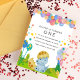 Plain white envelopes are included with paper invitations and will come to fit the invitation size you select. If you don’t need the envelopes, you may choose to not receive them by selecting the dropdown below "Envelopes" and choosing "None." If you’d like to have a design on your envelopes, you can browse all of these available envelopes to find the design that complements your Stomp Chomp Dinosaur 1st Birthday Invitation.