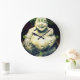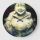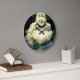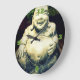 This funny photo shows a concrete garden ornament that looks like a Buddha. Here he sits with a huge round belly and a string of beads, with a big smile on his face. Green numbers for the main quarter hour marks.