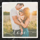 Personalized single square photo template and love script text on a stone table drink coaster.