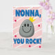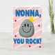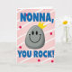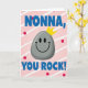 This card shows a friendly grey stone character centered on the front, with a smooth rounded shape and a sweet, welcoming grin that feels like a warm inside joke between close friends ❤️. Its simple face has two dark oval eyes and a wide curved smile, giving it an easygoing, affectionate look. A small pointed golden crown sits on top, adding a gentle “you’re cherished” touch without needing extra decoration. Behind it, a blush-pink background is filled with soft white diagonal stripes that create a light sense of movement. Bright red polka dots are scattered across the stripes like little bursts of celebration. Chunky three-dimensional blue lettering appears across the top as a friendly address, and matching blue text anchors the bottom with a confident line of admiration. The crown’s sunny yellow stands out against the pink field, while the red dots and blue letters keep the layout lively, with a tiny 🌼 feel in the color mix. The overall design keeps the crowned grey figure front and center, framed by diagonal white stripes on pink and sprinkled with red dots, with blue text above and below.