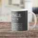 Stylish mug features latitude and longitude coordinates for Stonehenge, a UNESCO site on Salisbury Plain in Wiltshire, England. Silver Celtic border embellishment with dark gray background