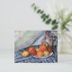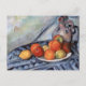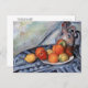 A postcard with the fine art impressionist painting by the French artist Paul Cézanne (1839-1906) titled, Fruit and Jug on a Table (1894). A still life with a plate of fruit, including lemons and apples, next to a stoneware jug on a blue tablecloth.