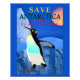 This poster features a cool global warming Save Antarctica Stop Climate Change themed design with full Antarctic full moon, Emperor penguin and frozen glaciers landscape.
