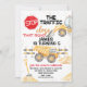 Boy's construction themed birthday invitation featuring a dump truck, escalator, dirt and red stop sign. Can be used for any age and ideal for a construction themed boy's birthday party.